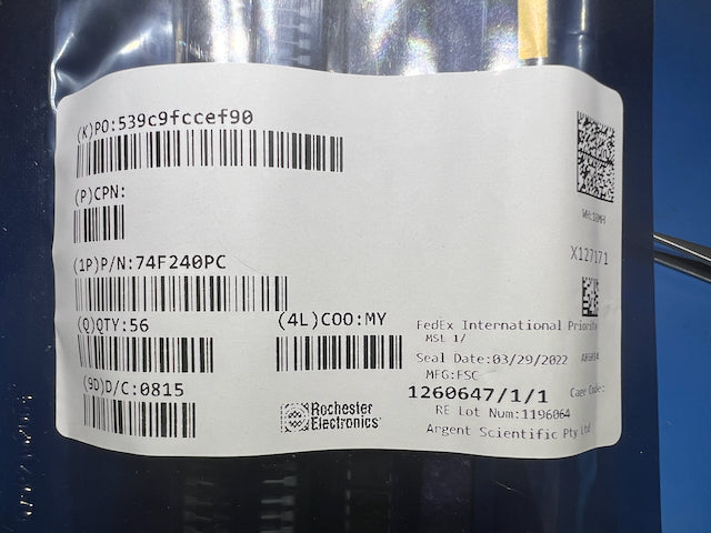 Manufacturer: Fairchild Part description: 74F240PC; Buffer/Line Driver 8-CH Inverting 3-ST Bipolar Case type: DIP20 Country of assembly: Malaysia Date code/batch number: 0815 (week 15, 2008) RoHS compliant: yes Production status: obsolete Notes about item: