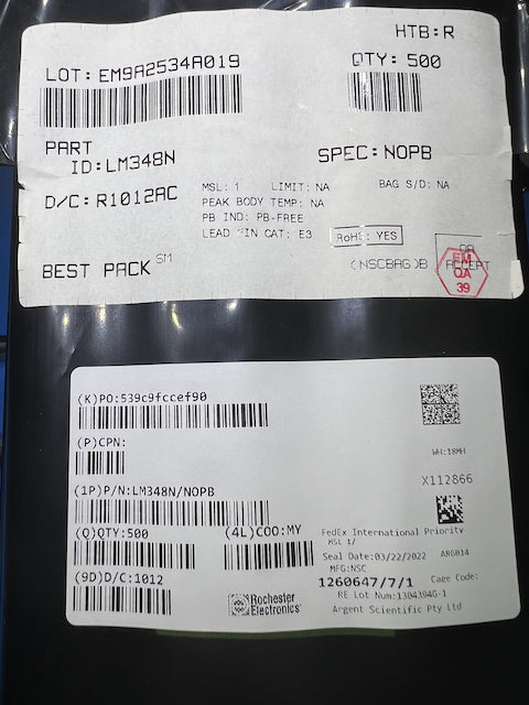 Manufacturer: National Semiconductor Part description: LM348N - quad 741 operational amplifier. Case type: PDIP14 Country of assembly: Malaysia Date code/batch number: 1012 (2010, week 12) RoHS compliant: yes Production status: currently produced by Texas Instruments, long lead time reported. Notes about item: